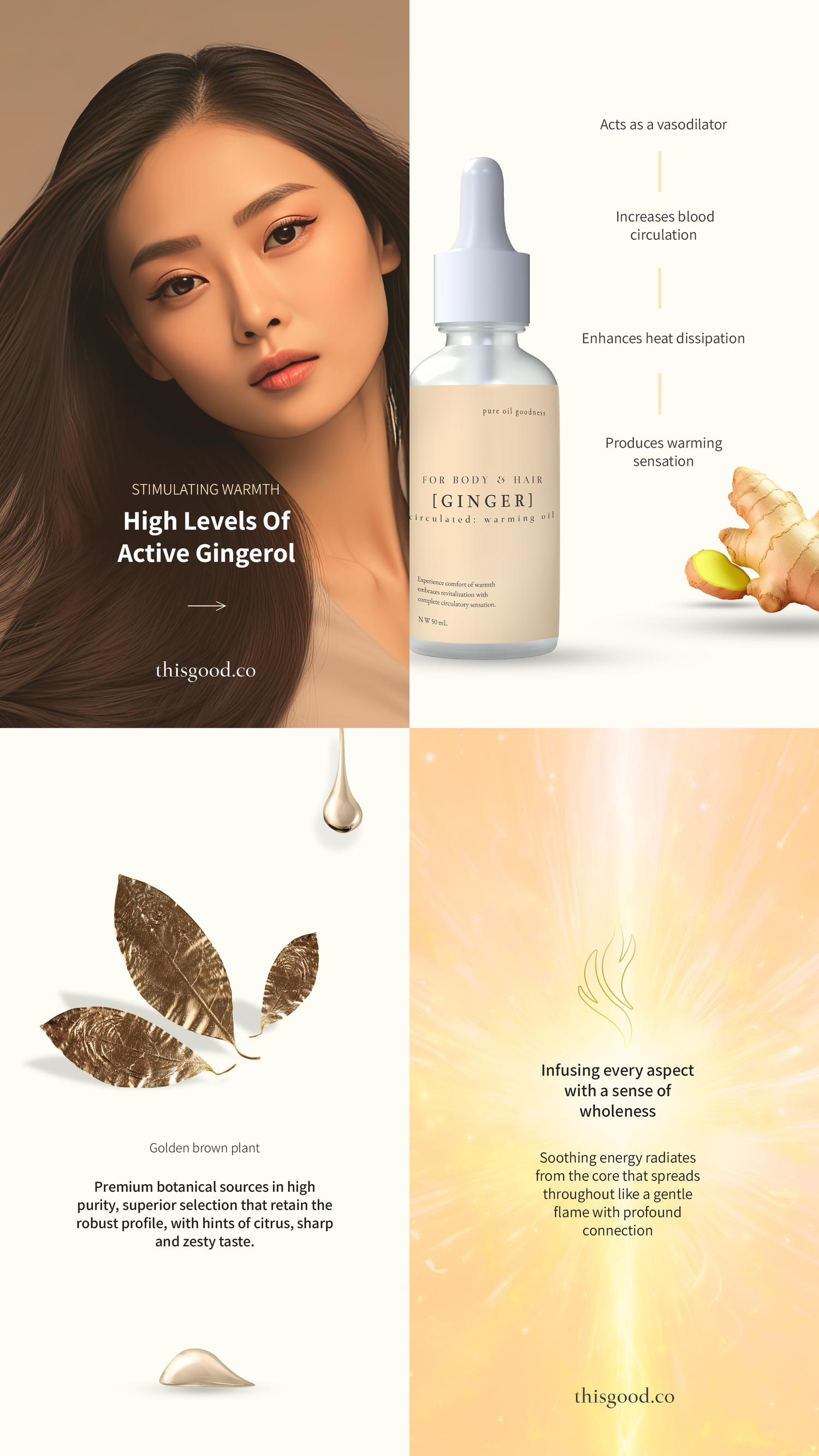 THIS GOOD Ginger Oil offers rich, spicy aroma with invigorating properties aim to relieve from soreness, offer soothing comfort, promote heat dissipation and drive overall circulation.